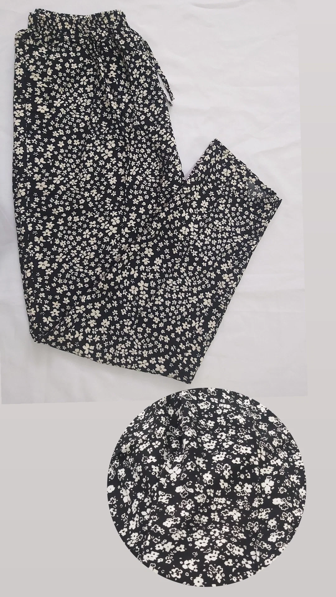 Pantalon fibrana negro y mini flores blancas etalle 10